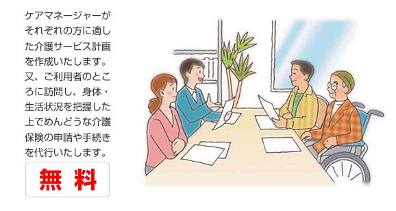 ケアマネージャーがご利用者、ご家族と面談し、状況や環境、生活歴や問題点等の課題を分析します。